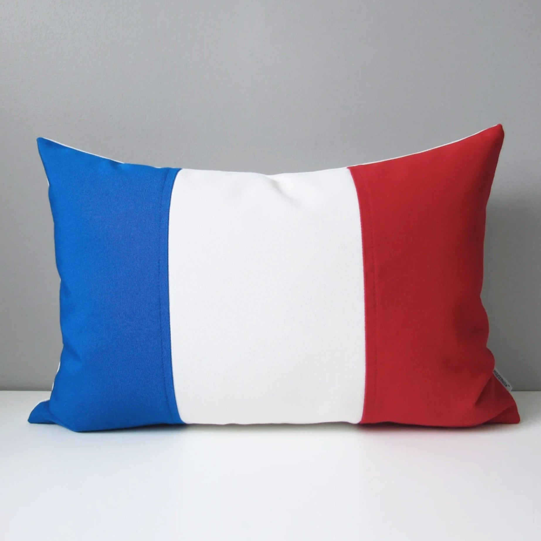 Decorative, French flag outdoor pillow cover in red, blue & white Sunbrella fabric. Unrivaled fade & stain resistance, ideal for poolside lounger, patio seating, games rooms or other active indoor spaces! Closes with a rust proof, home decor weight zipper.