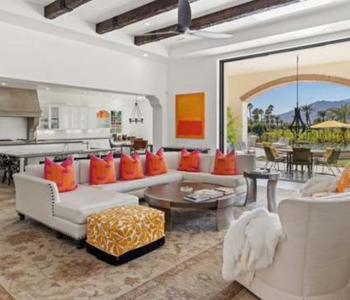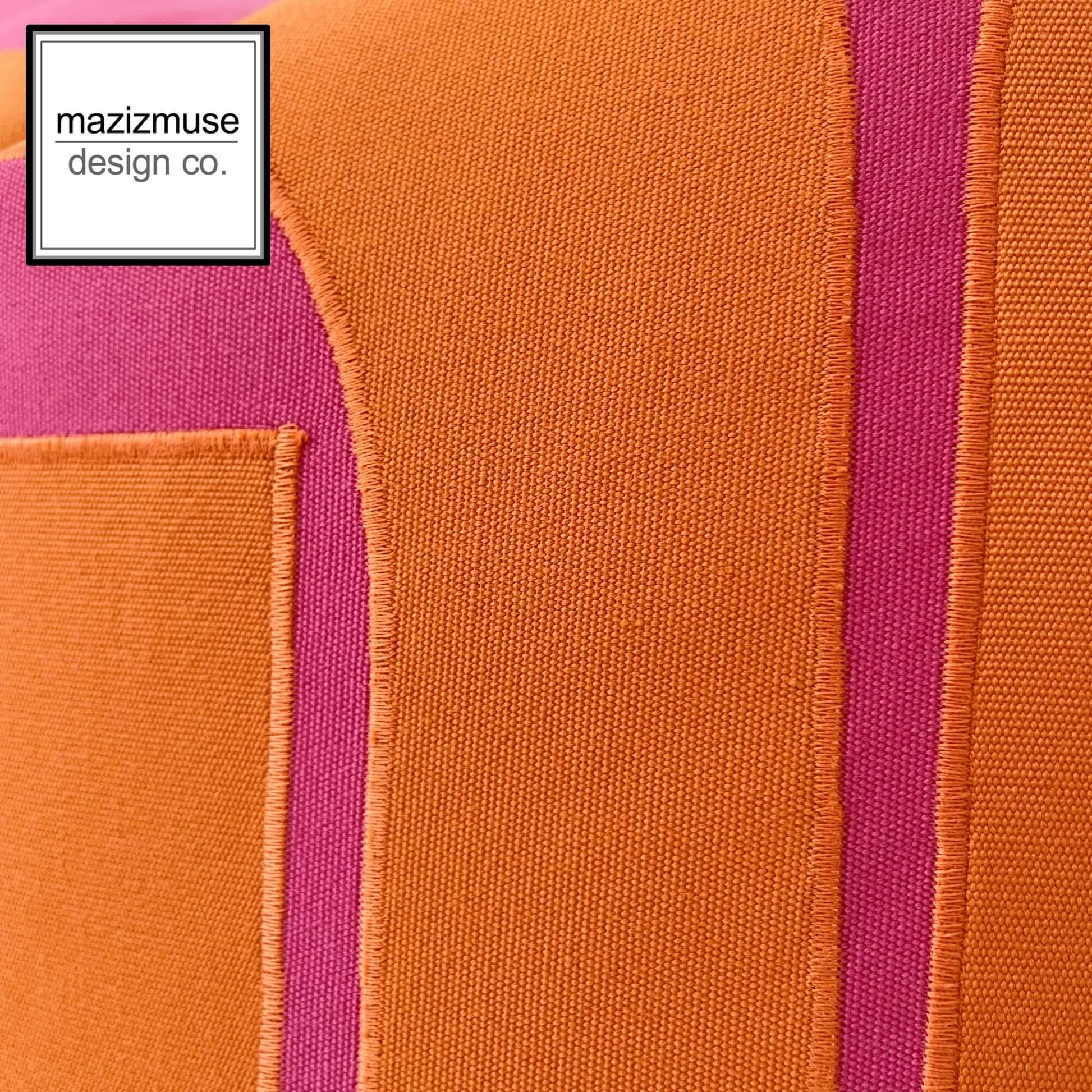 Decorative mod, pink & orange cushion cover sewn in Sunbrella indoor outdoor fabric. The back of the pillow cover is solid pink Sunbrella fabric. The geometric design is created using several pieces of hand cut fabric and meticulously appliquéd to secure a solid finish. Fully finished seams inside and closes with a home decor weight, rust proof zipper.
