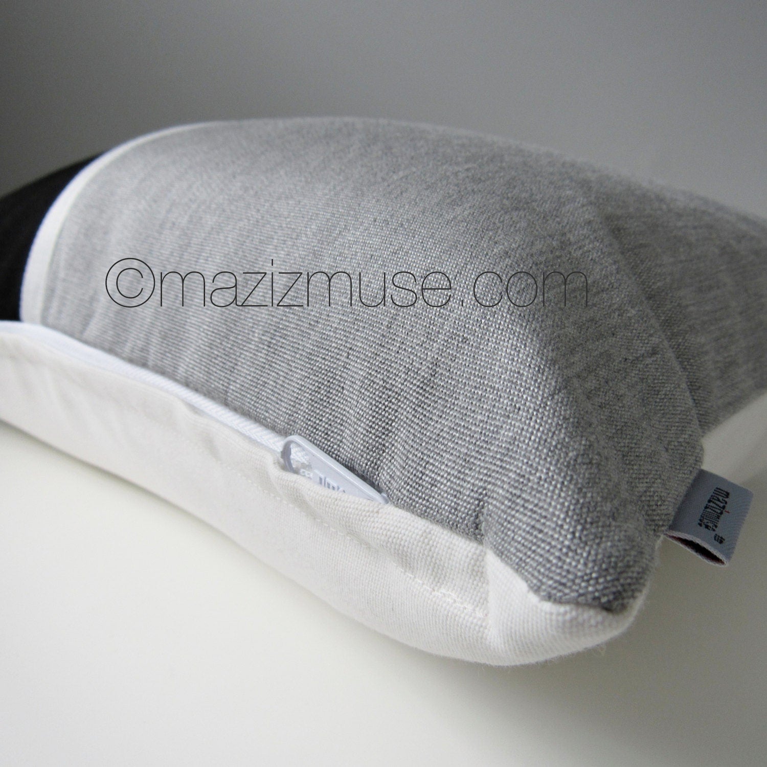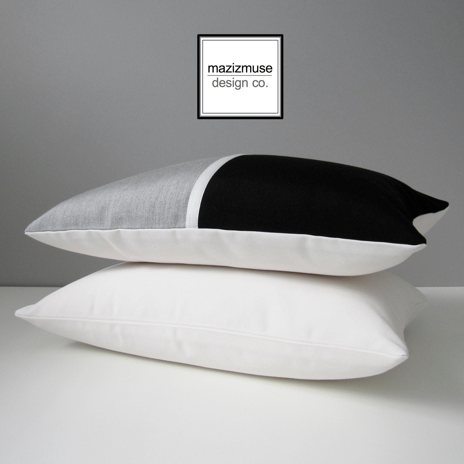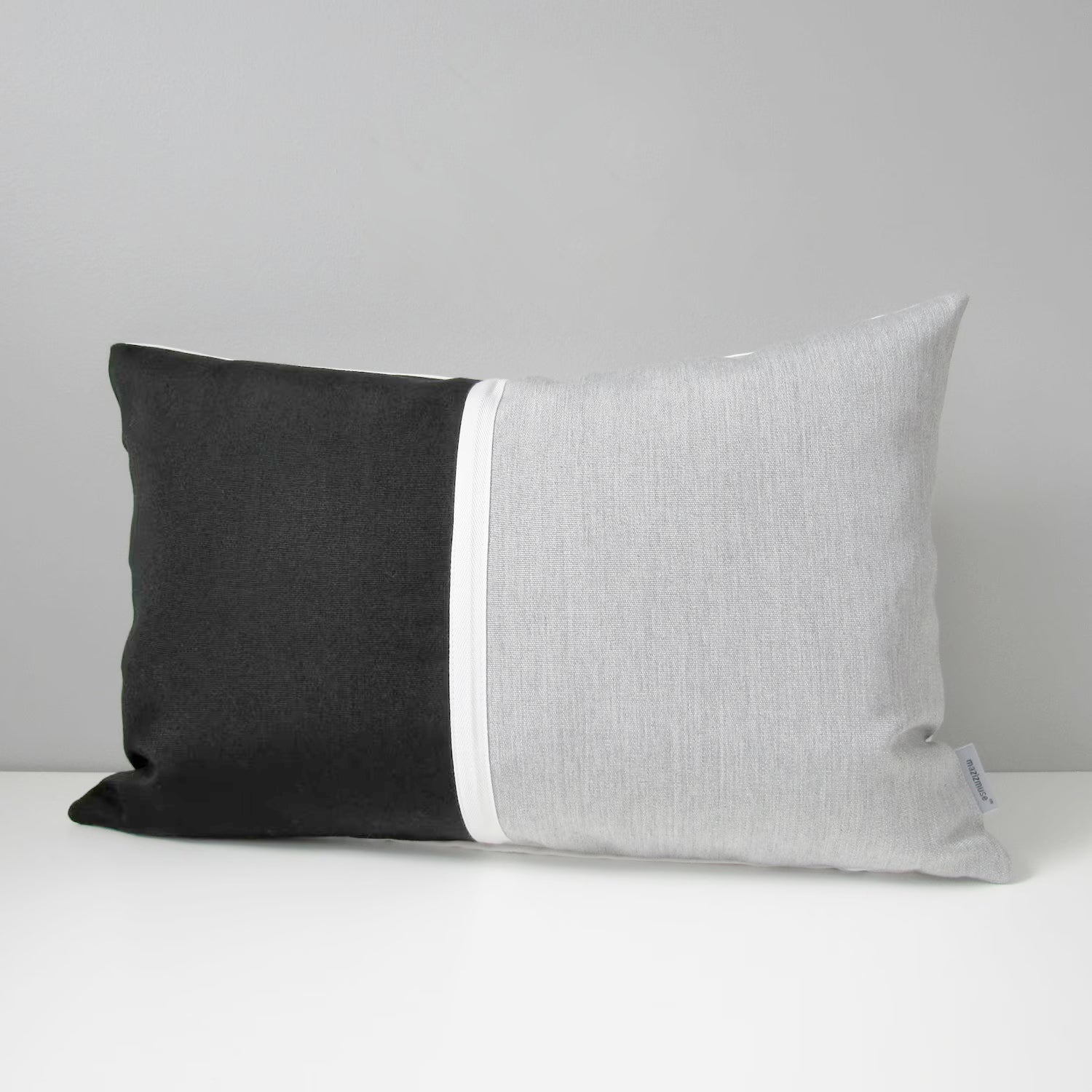 Decorative, Granite grey & black pillow cover in Sunbrella outdoor indoor fabric, featuring white trim detail. The back of the pillow cover is a solid black Sunbrella fabric, is fully finished on the inside and closes with a home decor weight, rust proof zipper.