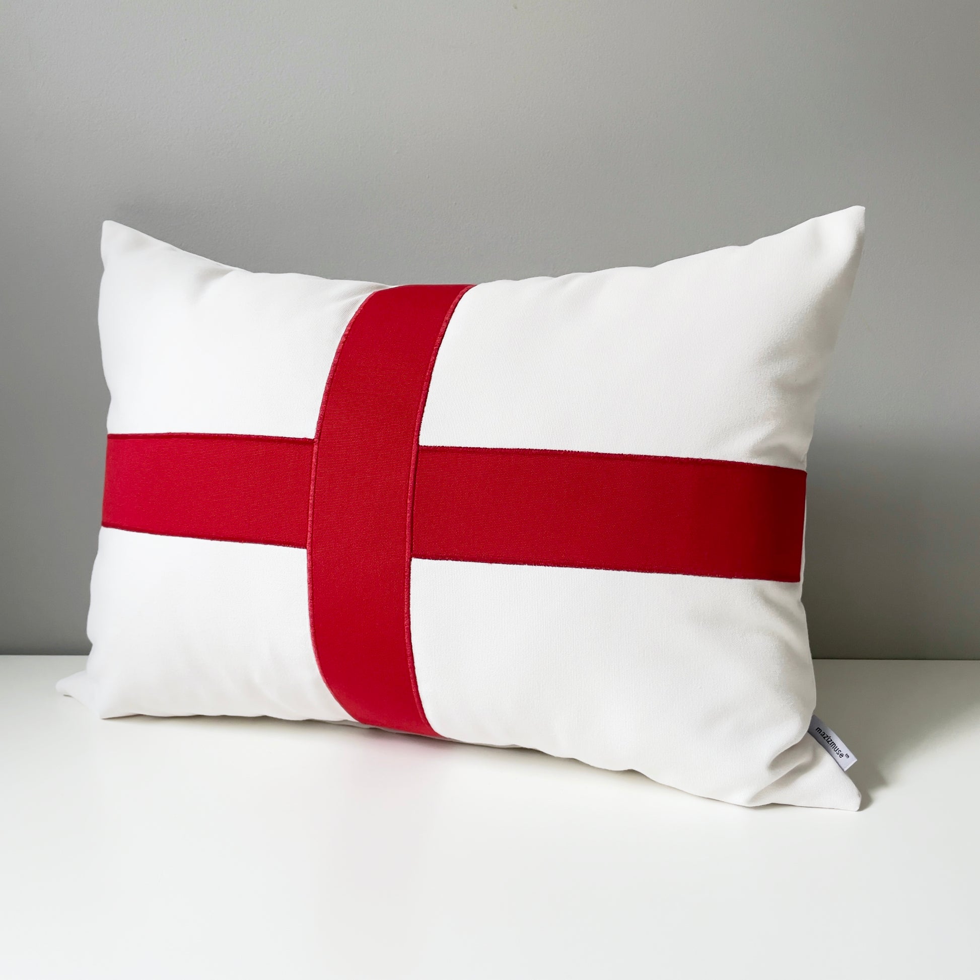 Decorative flag of England outdoor Sunbrella pillow cover with red St. George's Cross. Closes with a rust proof, home decor weight zipper.
